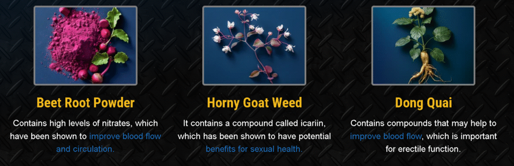 3. Enhancing Blood Flow Naturally: Beetroot powder, Dong Quai, and Ginkgo Biloba promote healthy blood flow, reducing issues like weak erections and poor stamina.